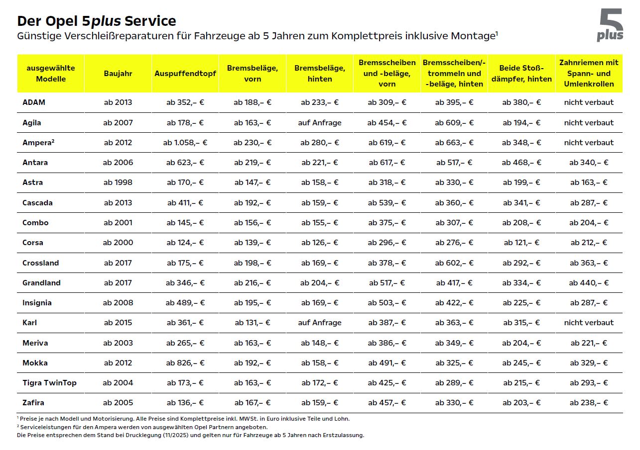 Der Opel 5plus Service ist unsere Komplettpreis-Offensive speziell für Fahrzeuge ab 5 Jahren nach Erstzulassung. Denn gerade bei älteren Modellen lohnt es sich, auf zeitwertgerechte Instandhaltungen zu achten.